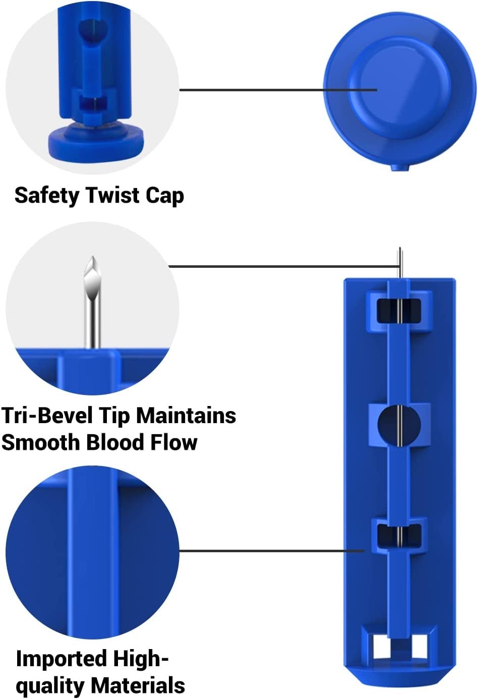 Minimal Pain: The lancets feature electro-polished, high-grade stainless steel needles with a fine tri-bevel tip designed to ensure a smooth penetration and minimize discomfort.