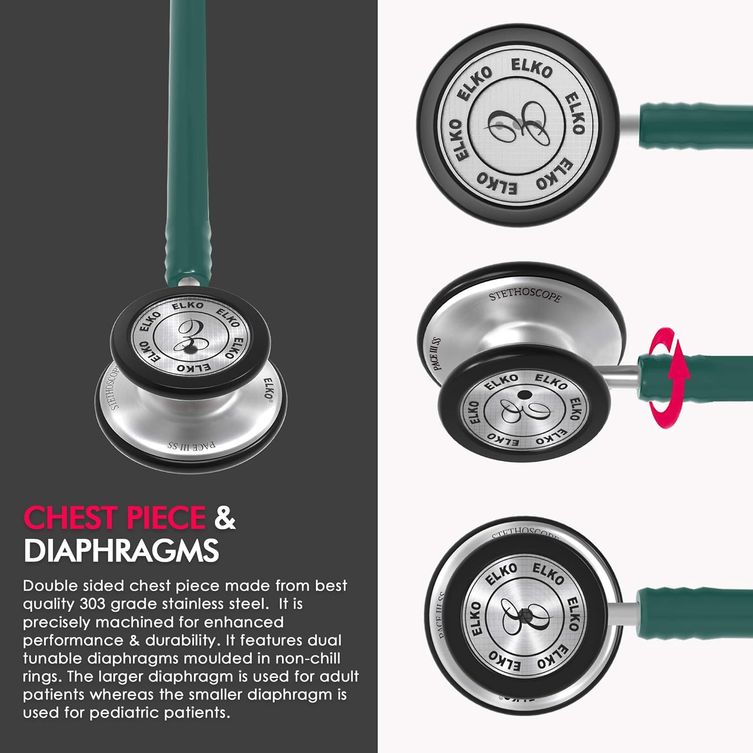 Key features of the ELKO EL-150 PACE III SS include high acoustic sensitivity and sound conduction for accurate diagnosis. The precisely machined, double-sided chest piece is made from 303-grade stainless steel and includes dual tunable diaphragms with non-chill rings for patient comfort. The headset has an anatomically correct angle and adjustable tension for a comfortable fit and clear sound transmission. It uses U-shaped, latex-free PVC tubing that is stain-resistant. Soft-sealing ear knobs made from synthetic material provide comfort and an acoustic seal. The stethoscope comes with extra ear knobs and replacement diaphragms and includes a 3-year warranty covering manufacturing defects.